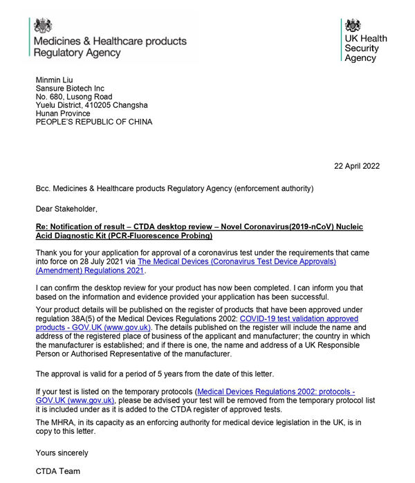 新冠检测试剂在英国上市必须经过CTDA审查和MHRA注册双认证,由于CTDA审查对产品性能的高要求,目前可在英国合法销售的新冠产品并不多。米兰生物新型冠状病毒(2019-nCoV)核酸检测试剂盒(荧光PCR法)临床性能和分析性能均满足CTDA高要求,且得到进一步有效验证,获得了CTDA的充分认可。